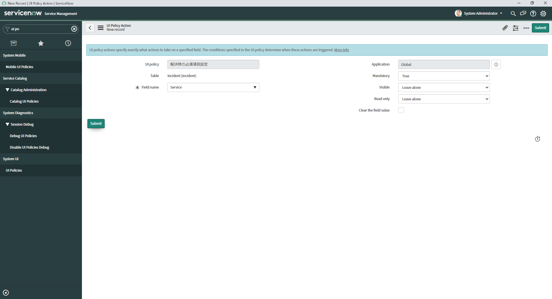 としてSaveし、UI Policy ActionsのタブでNew